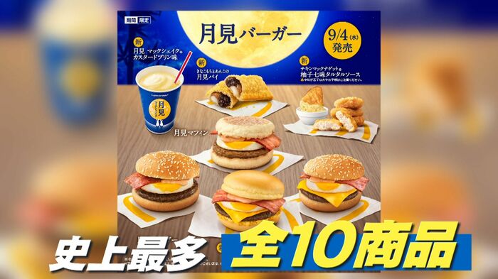 マクドナルドは4日から定番の「月見バーガー」に加え、新作の「芳醇ふわとろ月見」など、史上最多の10商品を販売します。