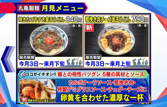 丸亀製麺も、「焼きたて牛すき釜玉うどん」や新作「粗挽き肉チーズ釜玉うどん」を販売しています。