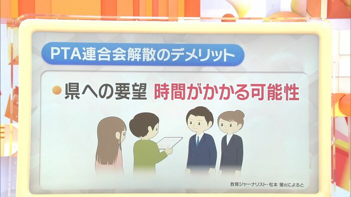 例えば、学校に「エアコンの設置を要望する」といった場合、これまでは県の連合会がまとめて教育委員会に要望を提出していたとのことですが、今後は市町村のPTAが各自で要望することが考えられるため、時間がかかるといったデメリットが予想されるということです。