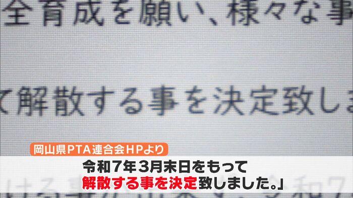 2024年9月2日、岡山県内のPTAが加盟する「岡山県PTA連合会」が2024年度末で解散することを発表。会員数の大幅な減少により活動が継続できなくなったことが理由だとしています。