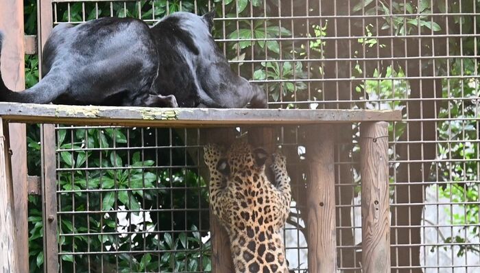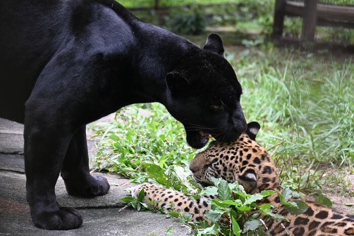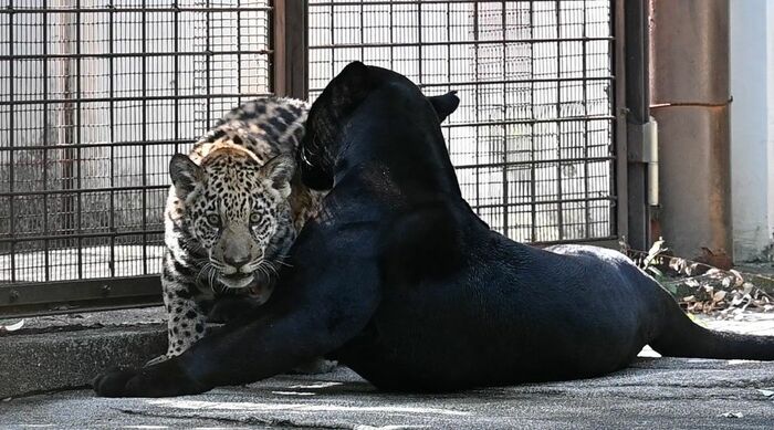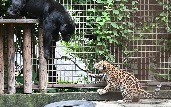 愛媛県立とべ動物園で暮らしているジャガー親子のお母さん「ミワ」と生後6カ月の「琥珀」。