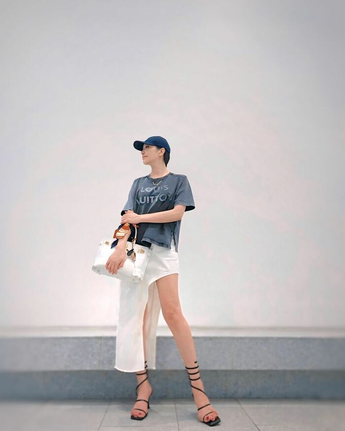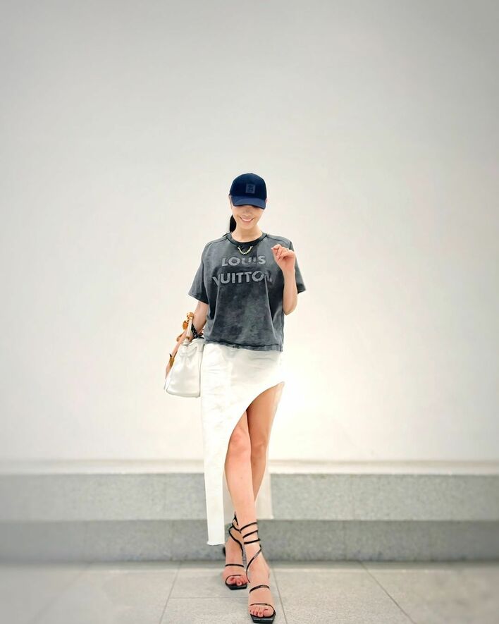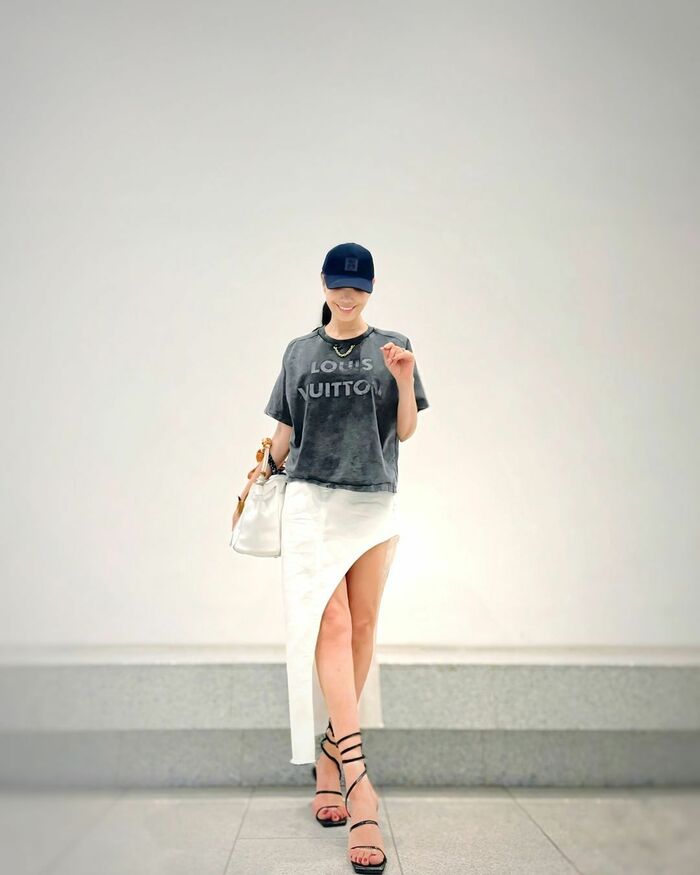 投稿された写真には、キャップを被りグレーのトップスに、ネットで購入したという片足が大胆に見えるホワイトデニムのスカートコーデのアン ミカさんが公開されています。