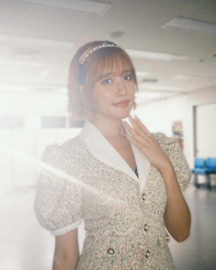 白い襟が付いた花柄の衣装に身を包み、パールが付いたカチューシャをした王林さんの姿が公開されています。