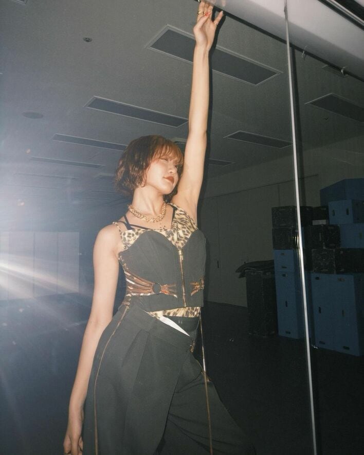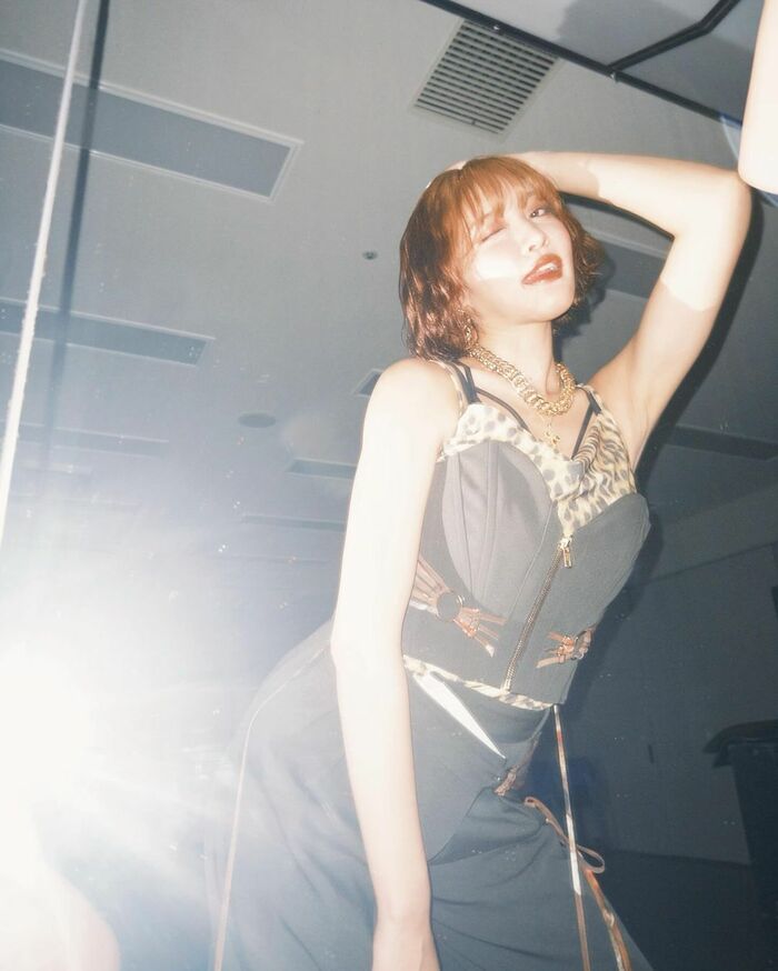 投稿された写真には、ヒョウ柄が特徴的なトップスでデコルテ部分があき、ウインクしながら舌をペロッと出す様子や…。