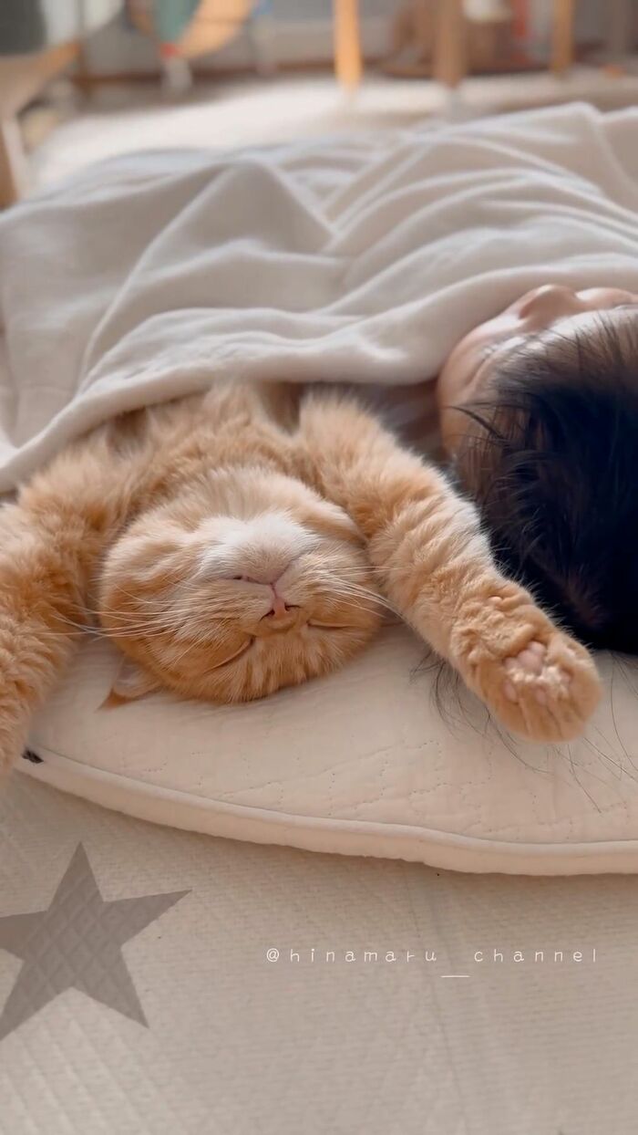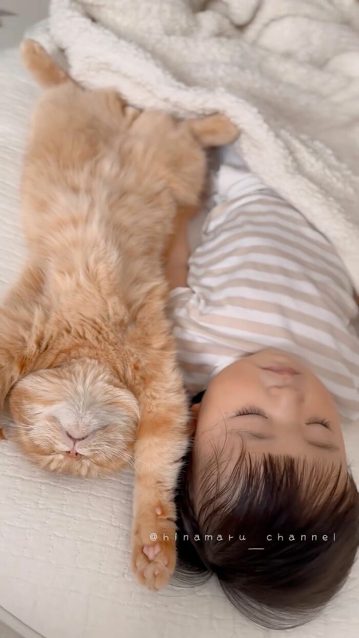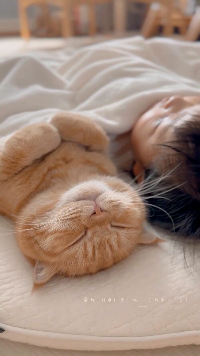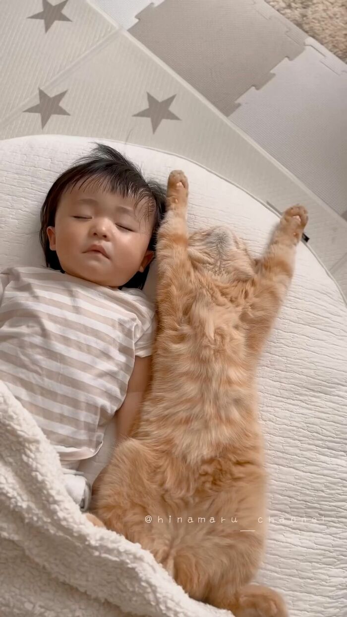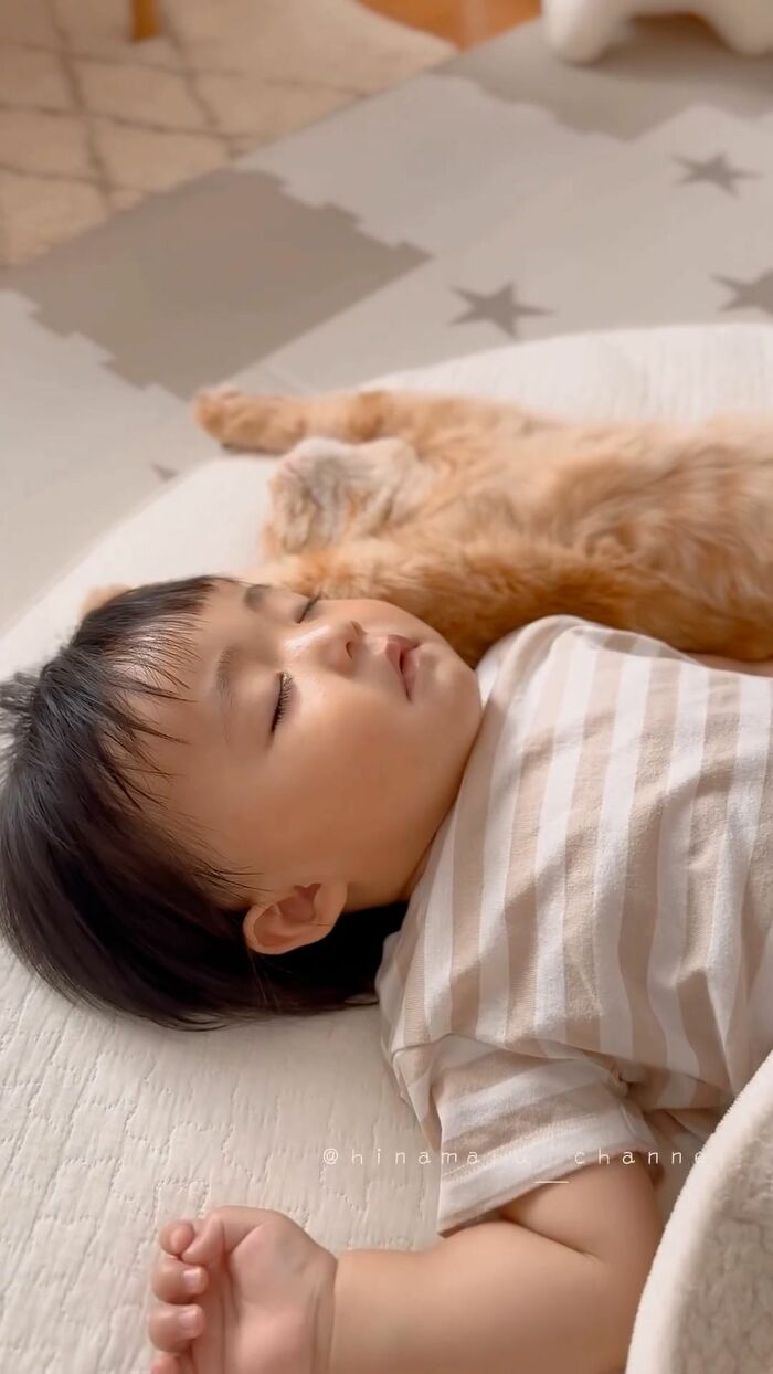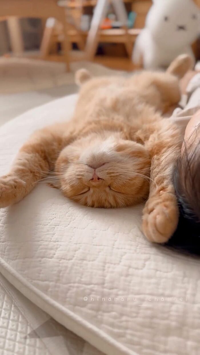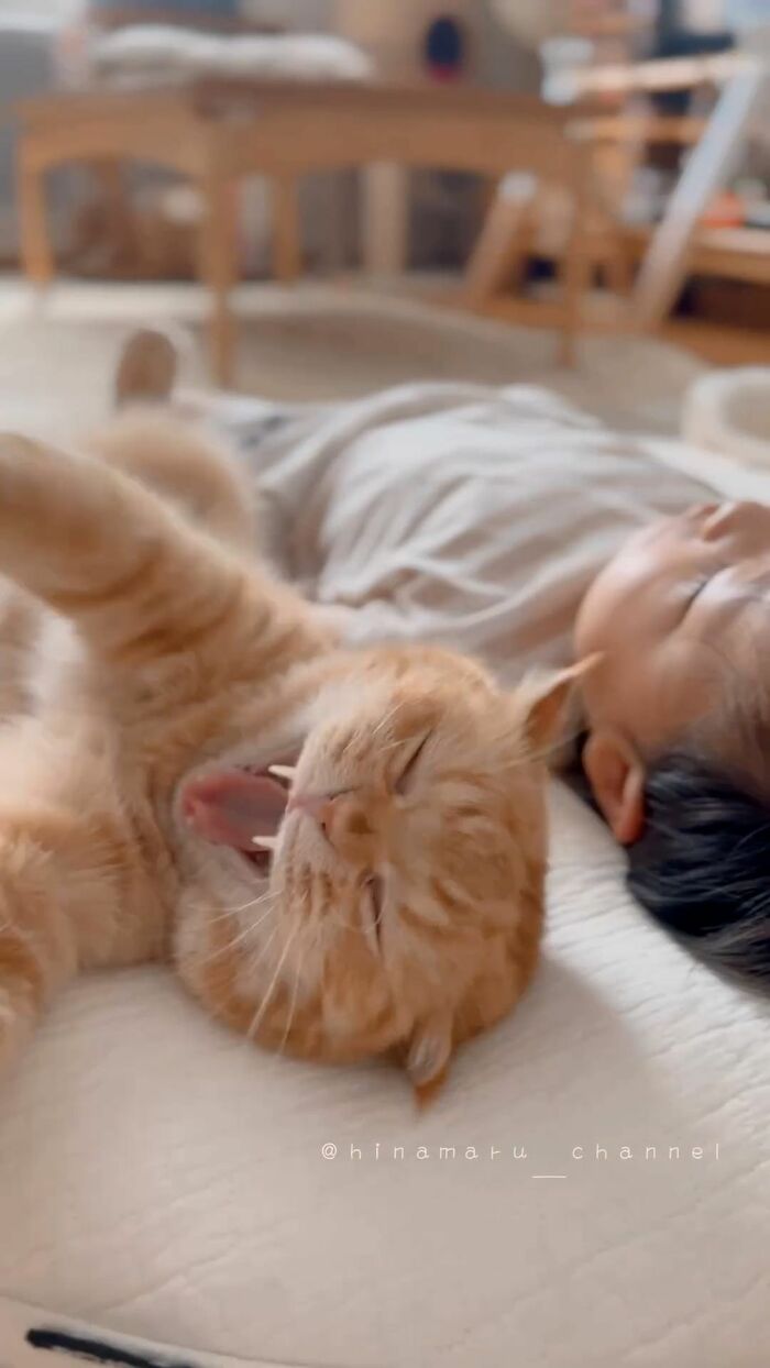 「スーパーマンになりひなたんのかわいい寝顔を守ってるまるにぃ 寝ている時も正義感の塊にゃ」というコメントとともに投稿されたこの動画。「夢の中でスーパーマンにでもなってひなたちゃんを守ってるのか?(笑)」と、思わず撮影を開始してしまったんだとか。