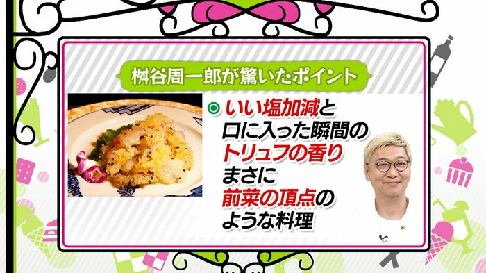 桝谷さんは「くらげ冷菜(トリュフ風味)」で驚いたポイントとして、「いい塩加減と口に入った瞬間のトリュフの香り。まさに前菜の頂点のような料理」とコメント。