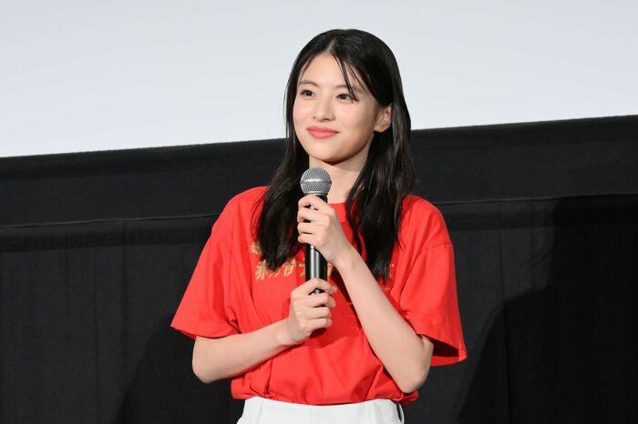 作品のロゴが入った赤いTシャツで登壇した2人。出口さんは「今日はよろしくお願いします」と元気に挨拶し、Tシャツを大胆にカットし、“美ウェスト”をのぞかせた髙橋さんは「最後の舞台挨拶なので、皆さんに楽しんでもらえるように頑張っていきます」と気合いをのぞかせました。