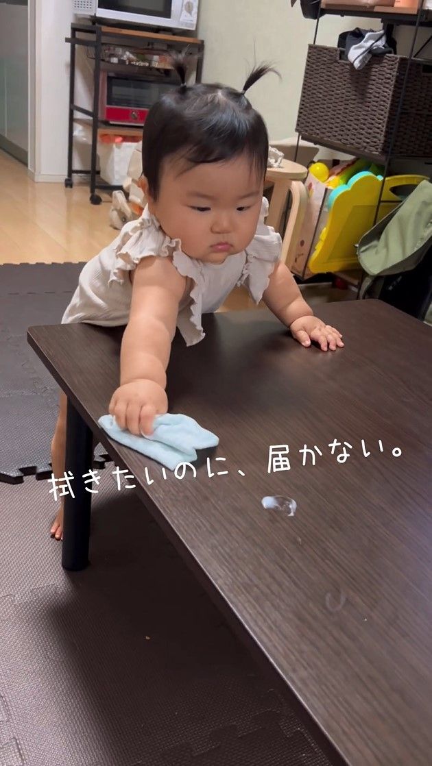 お母さんがテーブルにわざと汚れをつけ「これ拭いてください」と言うと、必死に手を伸ばして拭こうとしますが…ほんの少し届きません。