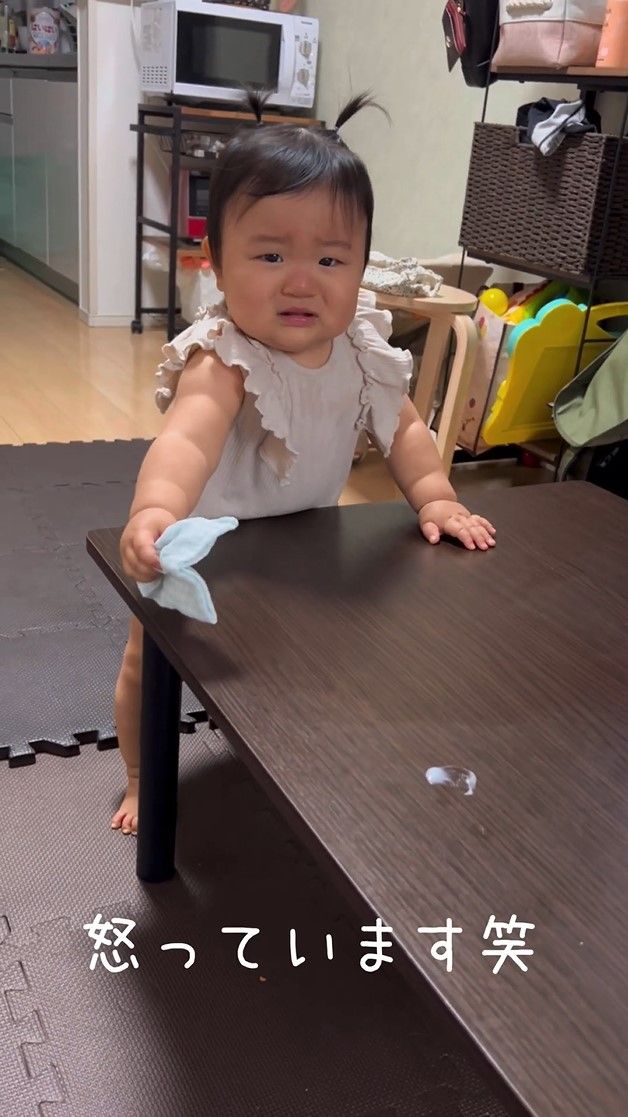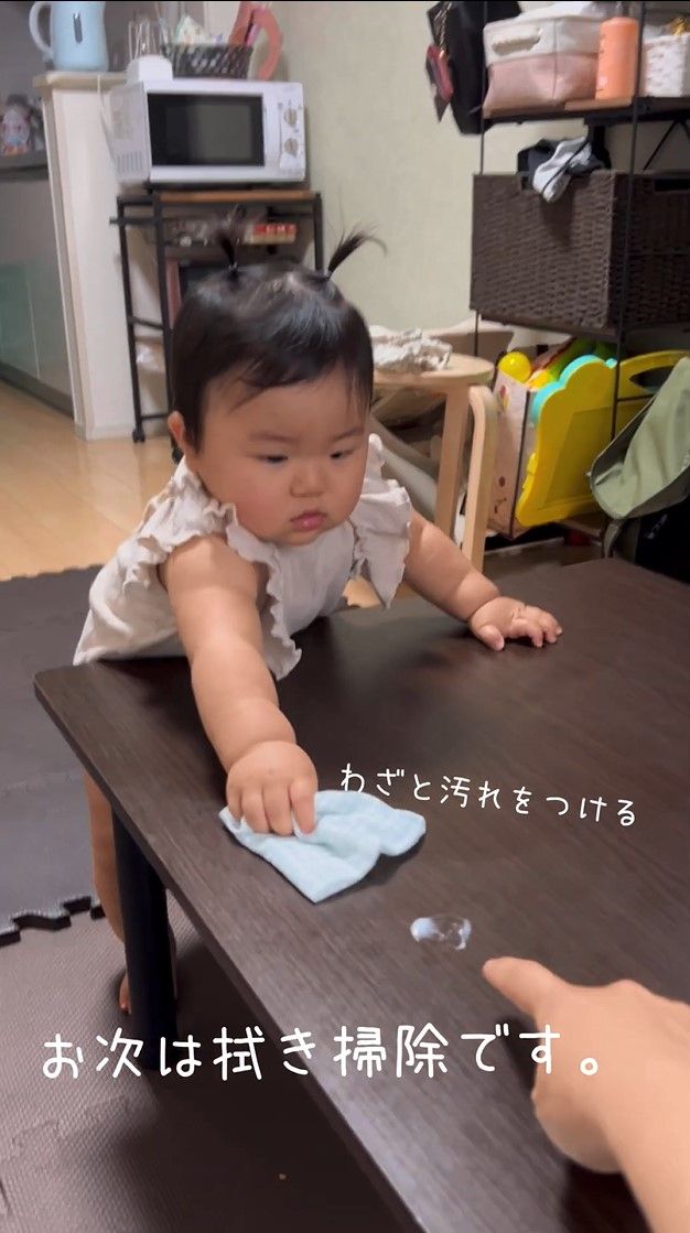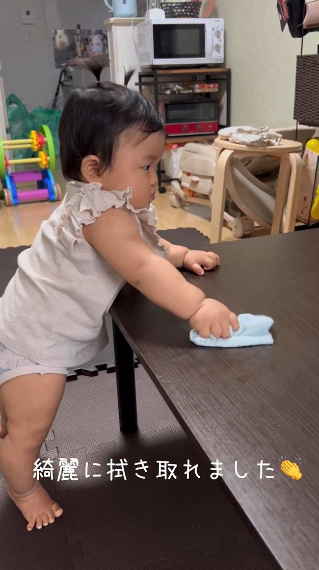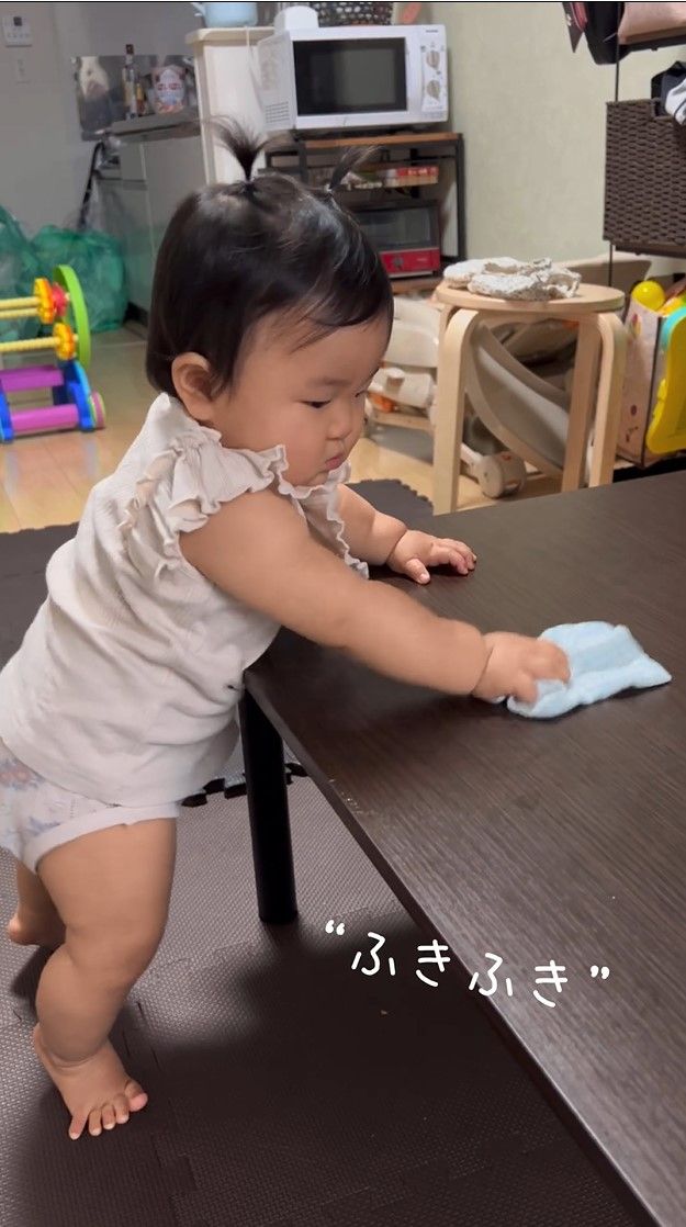 続いては、赤ちゃんが生後9カ月の時に撮影された様子。テーブルにつかまり立ちしている赤ちゃんは手に布巾を持ち掃除する気満々です。