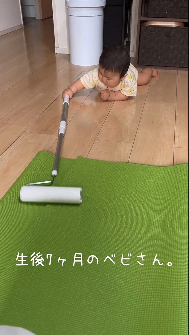 最初は赤ちゃんが生後7カ月の時に撮影された様子。うつ伏せの姿勢の赤ちゃんが右手で粘着クリーナーを持ち、カーペットの上を掃除し始めました。