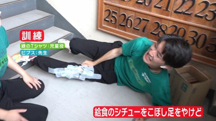 給食当番の児童が階段で被災。シチューをこぼし、足にやけどを負ってしまいます…。