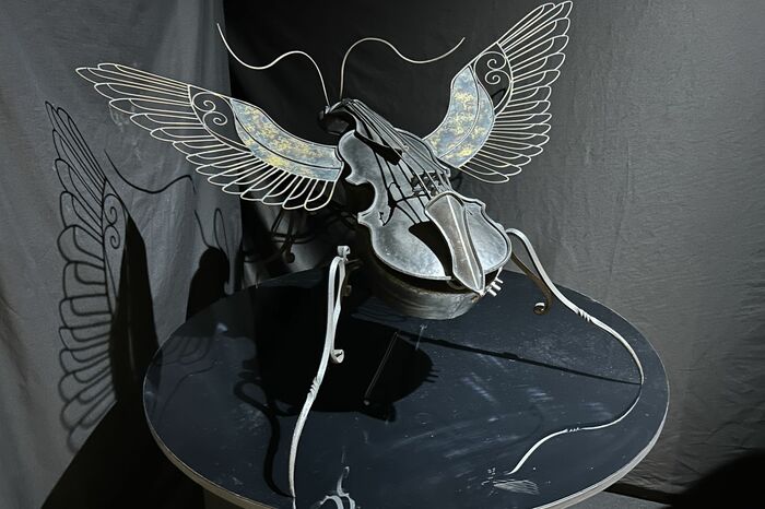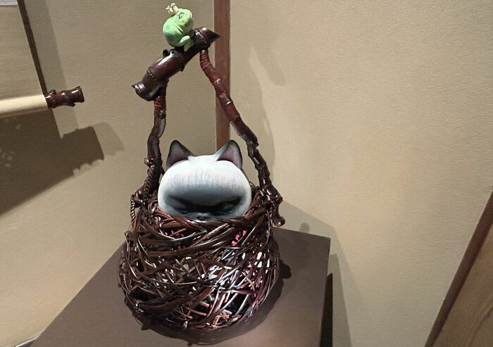さらに、佐久間アナは「かわいい!この虫、バイオリンの形してる!この猫もかわいい!」と不思議で生命力にあふれたメタルアートや、かごに逃げ込んだ猫がなんともかわいらしいアートに目を奪われていました。自由な発想やストーリー、モチーフの多様性が印象的です。