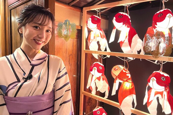 廊下の途中の小部屋には、鮮やかな金魚ちょうちんもありました。浴衣と金魚の組み合わせは、夏の日本の風物詩の鉄板ですね!