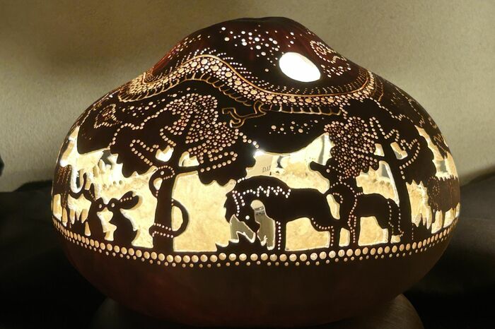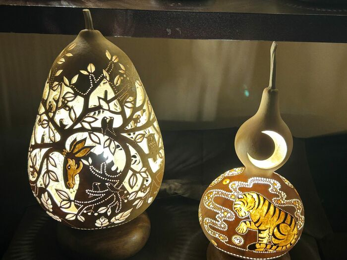 ちょっと異色なのが《おとぎばなしのいきものたち》。動物たちが主役のコーナーです。さまざまな形の瓢箪(ひょうたん)には、木に登る蛇やうさぎのような小さな生き物から、虎や馬といった大きな動物まで丁寧に彫り上げられていて、光と影のコントラストが見事です。