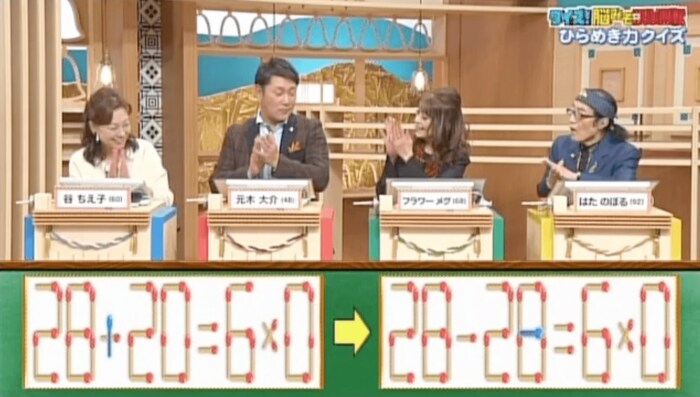 正解は、左の式の「+」からマッチ棒を1本引き、「20」の「0」の真ん中に置く。すると「28-28=6×0」となって、正しい式になりました。