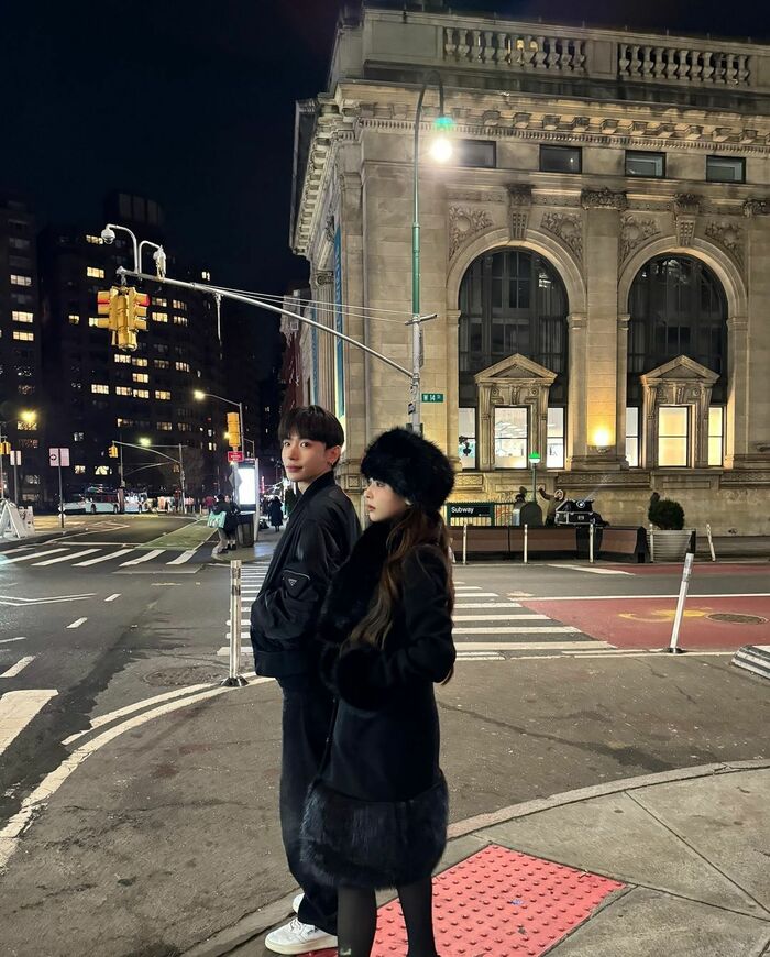 別の写真では、海外の街並みでミチさんが黒のロングコートに黒のファーの帽子をかぶった全身黒コーデで、よしあきさんと並んでいるきょうだいツーショットを披露!