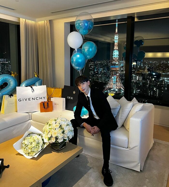 ライトアップされた東京タワーを臨むホテルの一室で、花束やプレゼントに囲まれた黒のスーツ姿のよしあきさんがポーズを決めている写真を公開し、「こんなに幸せ を感じていいのかなって怖くなってしまうくらいみなさんのおかげ で最高な24歳の始まりになりました! ありがとうございます!」と投稿文で感謝の気持ちを語っています。