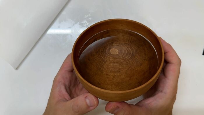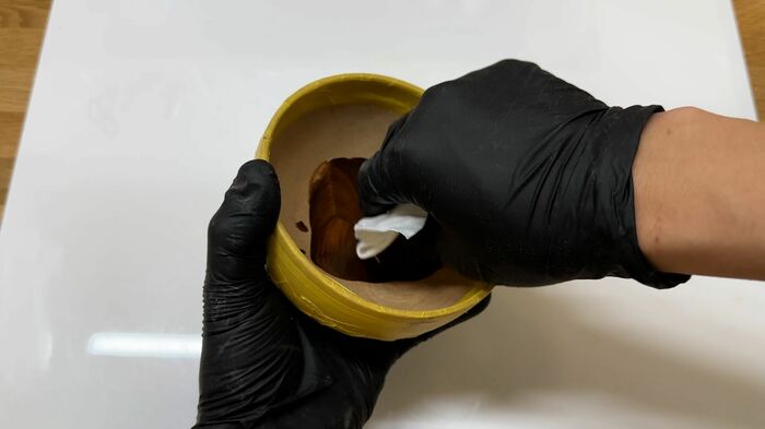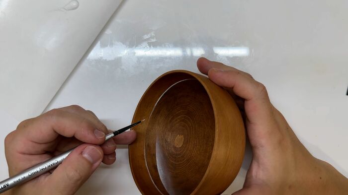 お椀の汁が入っている部分には薄茶色のオイルを塗り、その上から全体に蜜蝋を塗ることで1段階濃くなり、液体が入っているかのようなリアルさを表現。
