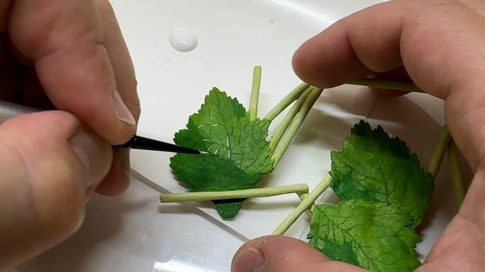 さらに部分的に汁に沈んでいたり、葉脈に沿って水が登ってきて光っているように着色をしたというこだわりよう。