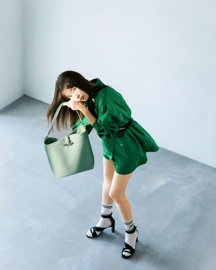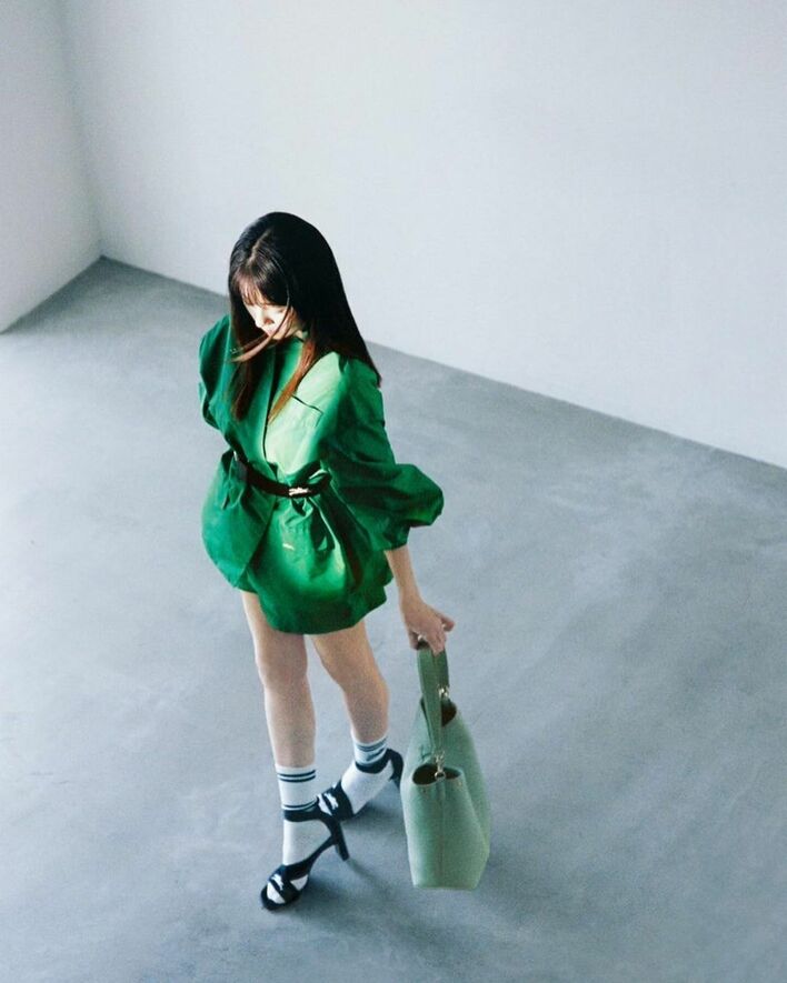 有村さんは緑色のハートの絵文字とともに雑誌の撮影のオフショットを公開。全身緑色で統一されたコーデで、ショート丈からはスラッとした美脚があらわに。