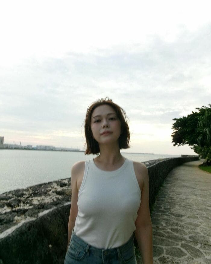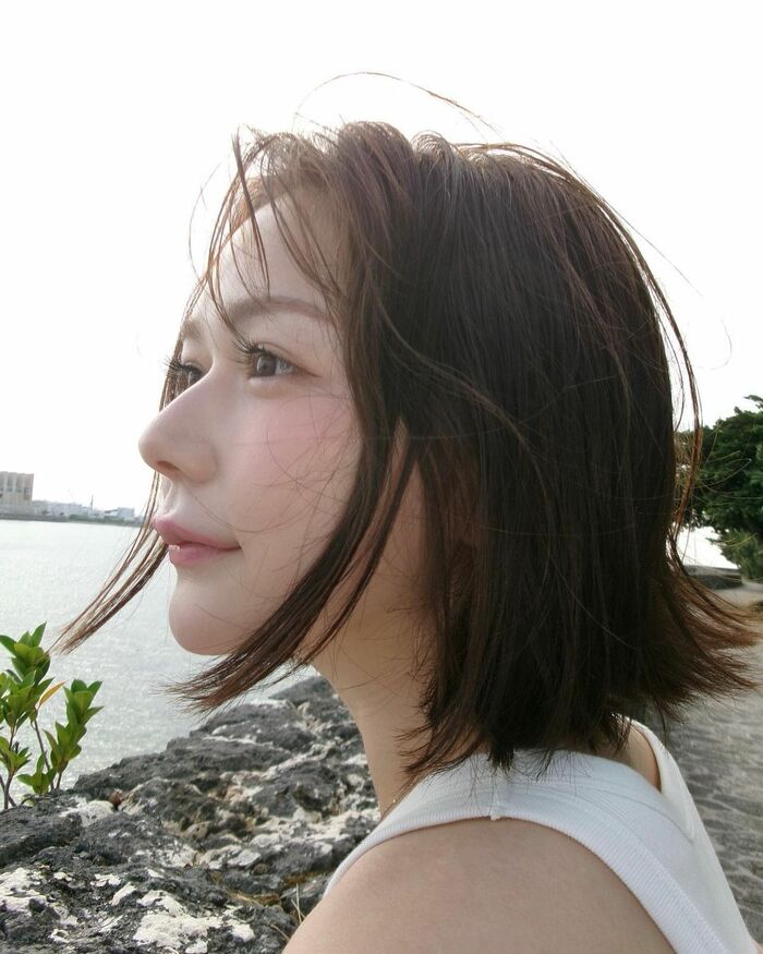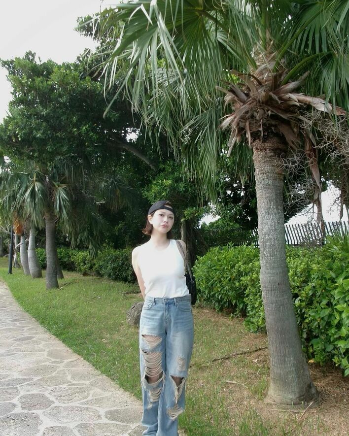 村重さんは「オシャレだと思って履いてたら おじいちゃんにお金がないと心配されたダメージジーンズを履いて沖縄の海を散歩しました お気に入りなので履き続けたいなと思います。そして見つめる先はただの岩です。それでも少し何か考えてるみたいな表情をしてみました。何も考えてないです いぇい」というコメントと共に、ダメージジーンズをはいた全身コーデを披露。