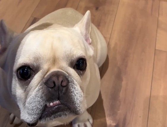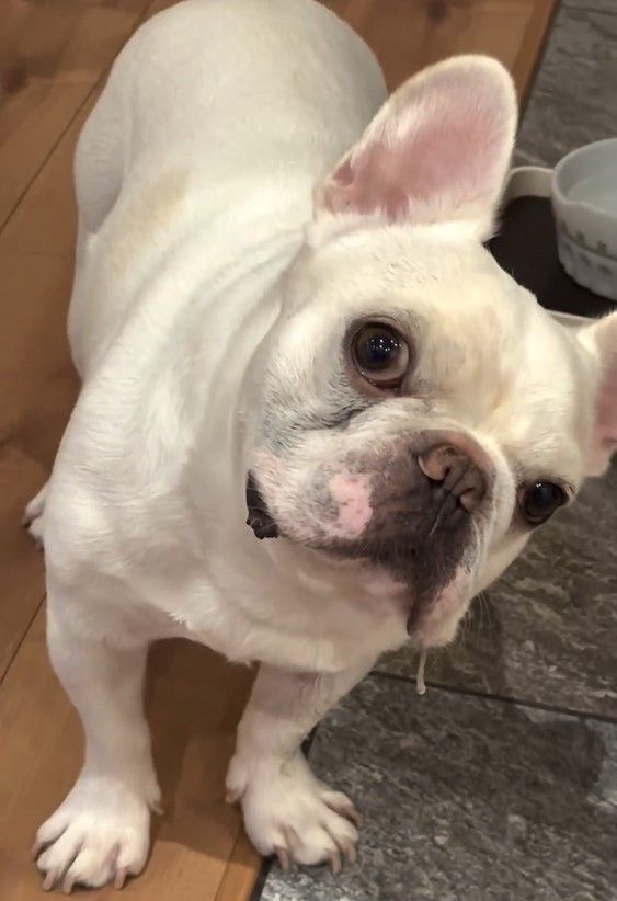 飼い主さんに熱い視線を送りながら、ヨダレまで垂らしてしまう「まるお」。