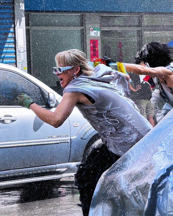 クールなショットを見せた一方で、雨の中での撮影の影響なのか、びしょぬれ姿で目を大きく見開きピースをするおちゃめなショットも公開しています。