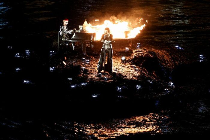 その後の演出でも、セーヌ川の上でピアノに火がつけられ燃えさかる中、ジョン・レノンの「イマジン」の演奏が行われるという演出も。