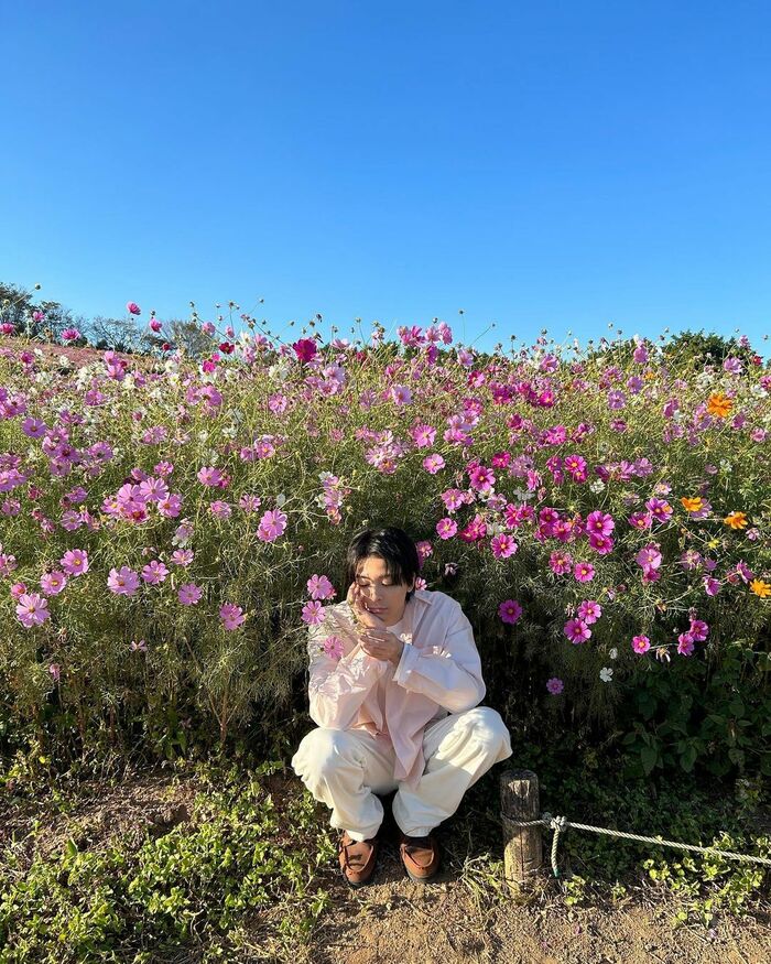 ピンクや紫色のお花をバックにしゃがみ、頰づえをついた思わず見とれてしまうショットを披露。