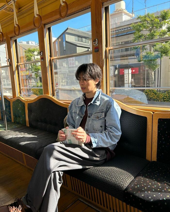 また、レトロ感のある電車の座席に座り、メガネをかけるレアなショットや…