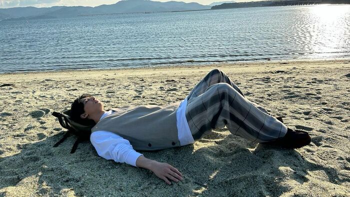 公開されたショットを見ると、太陽に照らされた海の浜辺で、カバンを枕にして寝そべる姿や…
