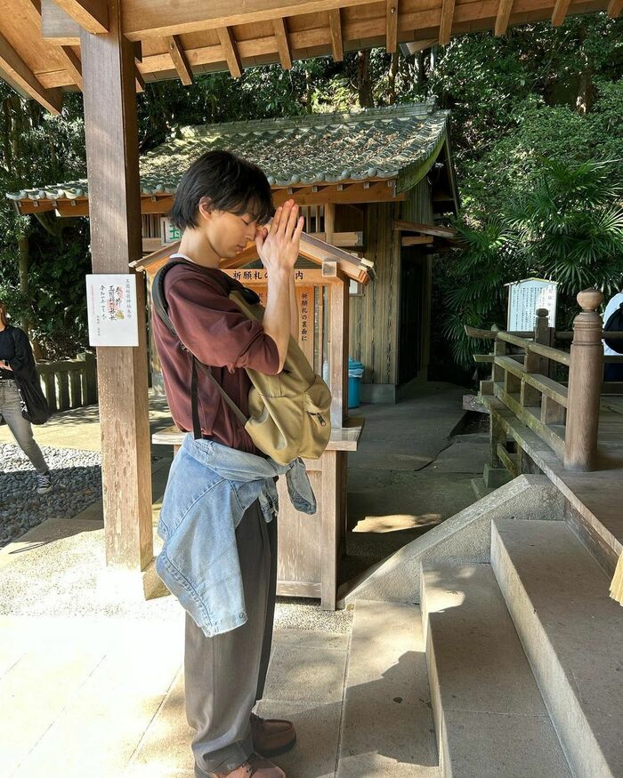玉園稲荷神社に訪れ、目を閉じて何かお願いをする姿も!どんなお願い事をしたのか気になります。