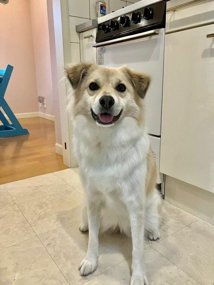 アリソンとは、我が家の家族、2歳のわんちゃんです。犬種は雑種で、何がミックスされているのかわからないですが、白とベージュと黒のふわふわなとってもかわいい女の子です。
