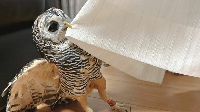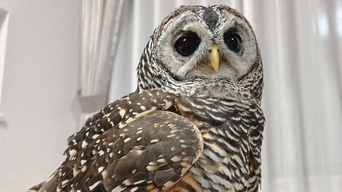 目がくりくりとした、3歳のアカアシモリフクロウ「かなた」ちゃん。