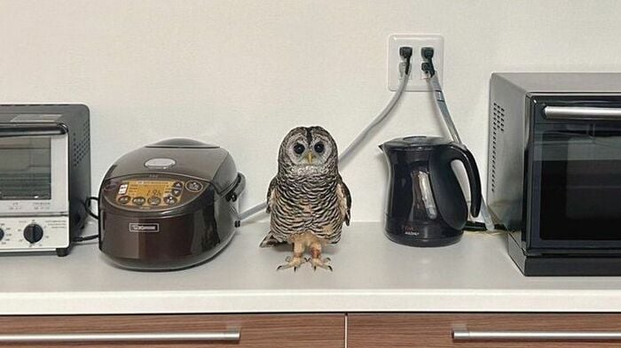 リビングを自由に飛び回ったりすることもありますが、じっとしている事の方が多いようで、キッチンのカウンターに置かれた電子レンジやポッドの近くに並び、直立していたことも。
