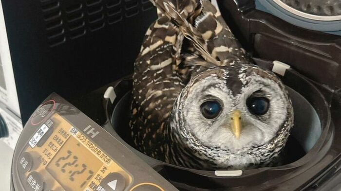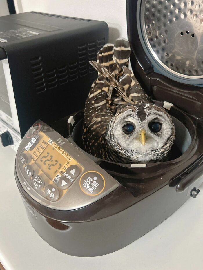 飼い主によると、なぜか炊飯器の中が好きなようで、使用していない時にふたが開いていると中に入り「ボボボボボ」と鳴くそう。