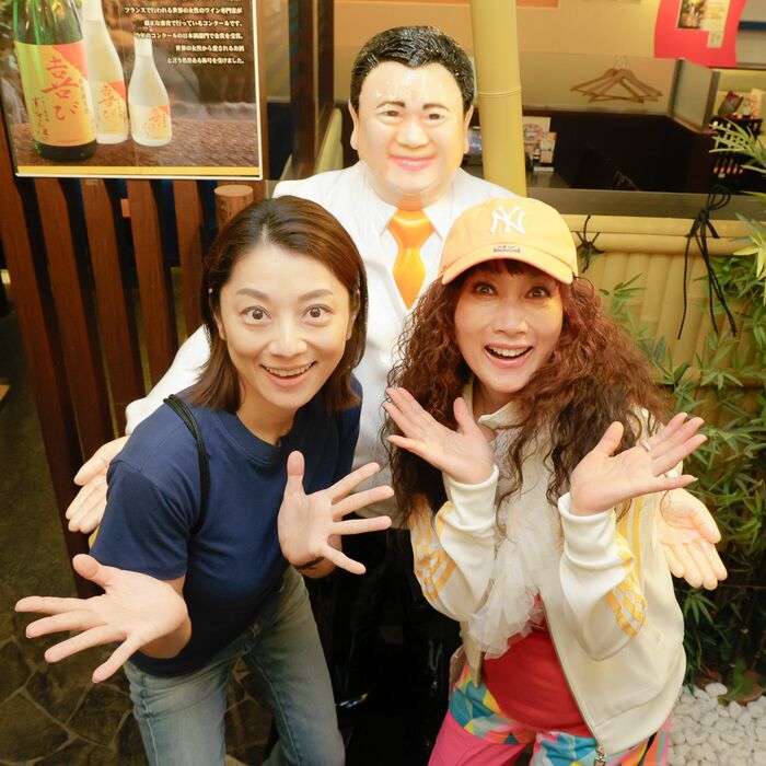 笑顔で両手を広げてポーズをとる2人。そのうしろには、寿司チェーン店「すしざんまい」の各店頭に飾られている、おなじみの人形が。