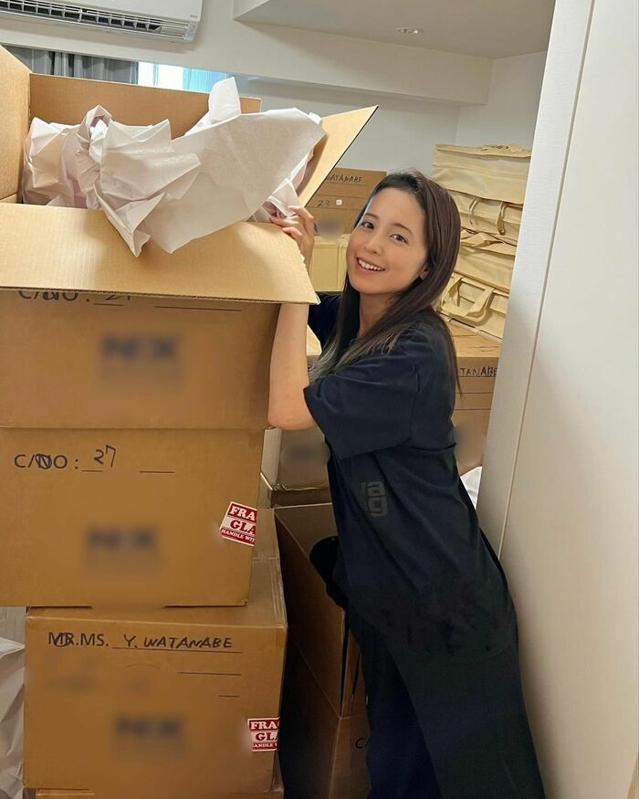 「ダンボールを開けるとそういえばこんな物あった!と懐かしくなったり、新たな発見があったりして楽しいです」と、思い出に浸りながら荷ほどきを楽しんでいる様子で、中には「Y.WATANABE」と書かれた段ボールも。