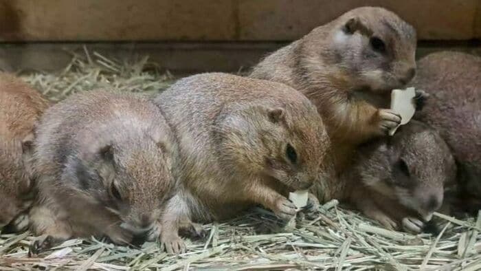 ピッタリとくっついて並び、モグモグとご飯を食べるプレーリードッグたち。