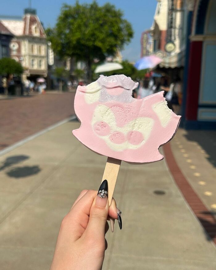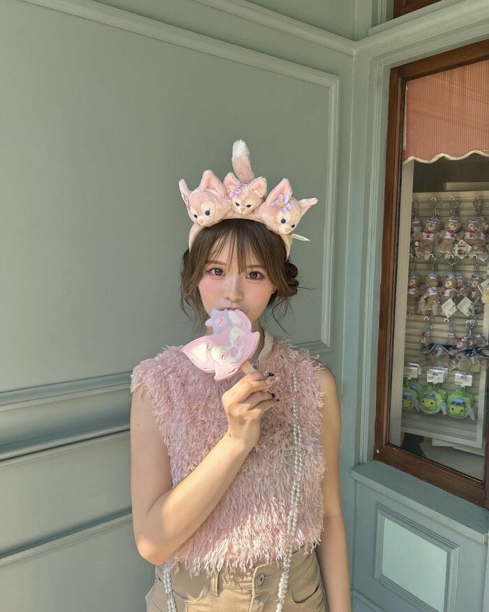 その手には、リーナ・ベルの形をしたアイス!さらに、ふわふわのモヘア生地トップスもリーナ・ベルと同じ薄桃色で、まさに“リーナ・ベルコーデ”です。