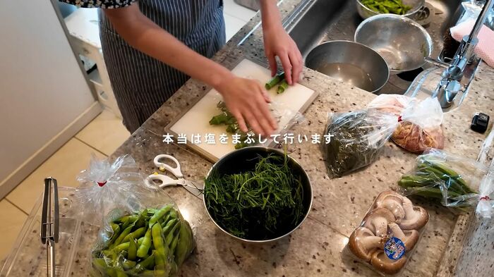 蒸した枝豆をフライパンでソテーする場面では、「プロの方は香り付けだけしてにんにく取るとかって言いますよね?でも大丈夫取らなくていい。私は取らない」と、あくまで家庭料理なことを強調。