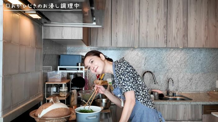 「カメラを忘れちゃってるね私は たまにはこうやって(カメラを)見て」と、おかひじきを茹でながらカメラレンズを覗くお茶目な姿も。