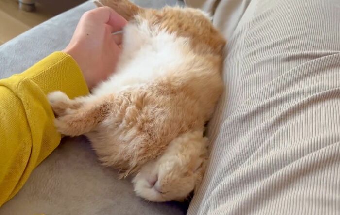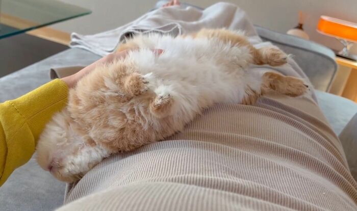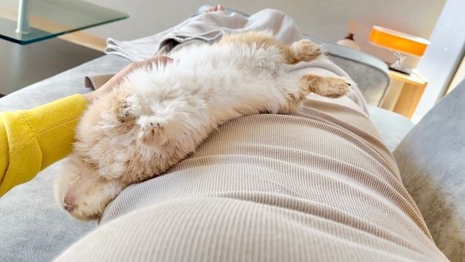 公開された動画を見てみると、お昼寝中のいなりくんが飼い主のお腹に乗って横になり、足を投げ出してスヤスヤ…