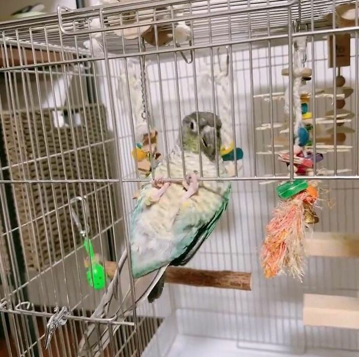 そんなベルヴェールちゃんですが、ある日の夜にケージの外に出ようとケージをつたって降りていると…その下にはつかむところがありません!