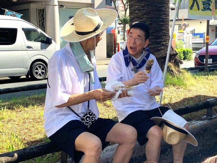 300年もの歴史を持つという土佐の「日曜市」を訪れた2人は、食べ歩きを開始。日曜市の名物「いも天」などを堪能しつつ、地元の人々と交流します。