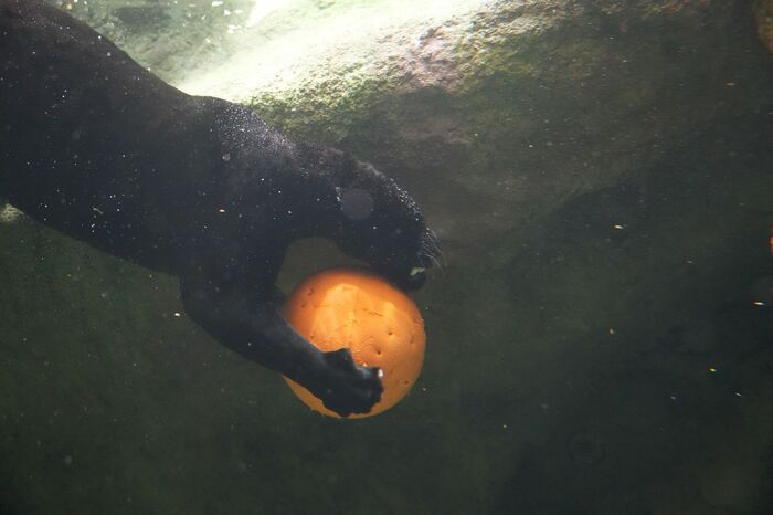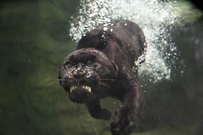 飼育員によると、なぜこのような表情になるかは分からないが、泳ぐ際はいつもこのような顔になってしまうとのこと。