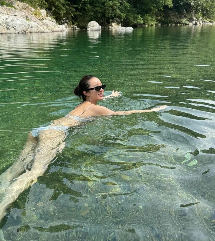 また、髪をお団子にまとめて、実際に川に入り泳ぐ気持ちよさそうな様子も公開しています。