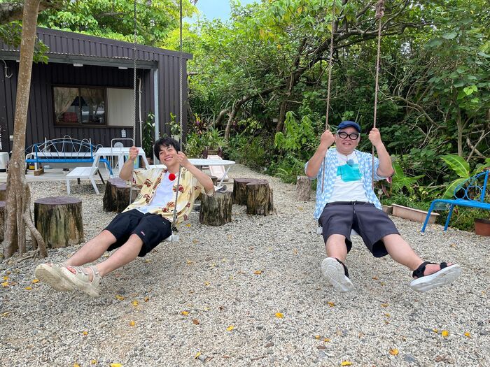 ホテル・カフェ・ショップが集まった施設で、海を眺めながらゆったりと過ごすことができます。ドリンクを片手に、モモコさんは「なんで奄美に住もうと思ったん?」「お父さん(明石家さんま)、お母さん(大竹しのぶ)の反対はあったん?」など、IMALUさんに質問攻め!