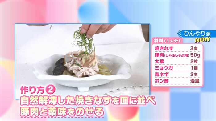 続いて冷凍庫から出し自然解凍した焼きなすの上に、豚肉と薬味をのせ、仕上げに冷たいポン酢をかければ…