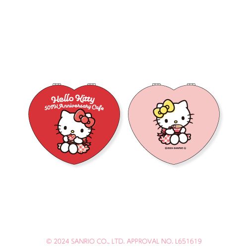 2つ目は、日々持ち歩きたい「ハート型ミラー」。赤とピンクのカラーリングが可愛いミラーで、キティとミミィがキュートにこちらを見つめています。